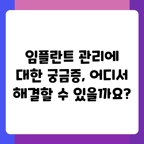 임플란트 관리에 대한 궁금증이 있다면, 주저 말고 치과에 문의하세요. 정기적인 검진은 물론, 궁금한 점이나 문제 발생 시 언제든지 치과 의사와 상담할 수 있습니다. 또한, 다양한 온라인 정보들을 참고할 수 있지만, 정확하고 신뢰할 수 있는 정보를 얻기 위해서는 전문가의 도움을 받는 것이 중요합니다. 임플란트 관리에 대한 정보를 얻는 데 있어서 온라인 정보는 참고 자료로 활용하는 것이 좋습니다. 의료적인 문제는 반드시 전문가와 상담하여 해결하는 것이 가장 안전하고 효과적입니다. 정확한 정보를 통해 성공적인 임플란트 생활을 누리세요. 그리고 임플란트 시술 후 관리에 대한 정보는 치과의사나 구강 위생 전문가에게 직접 문의하는 것이 가장 좋습니다.