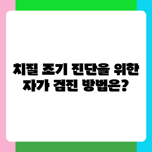 치질은 조기에 발견하면 간단한 치료로 증상을 호전시킬 수 있기 때문에, 자가 검진을 통해 초기 증상을 파악하는 것이 중요합니다. 거울을 이용하여 항문 주변을 직접 관찰해보세요. 항문 주변에 혹이 만져지거나 튀어나온 부분이 있는지, 출혈이나 분비물이 있는지 확인하는 것이 좋습니다. 하지만 자가 진단은 한계가 있으므로, 이상 증상이 발견되면 반드시 병원을 방문하여 전문적인 진찰을 받아야 합니다. 자가 검진은 참고 자료일 뿐, 최종 진단은 전문의가 내려야 합니다. 또한 평소 배변 습관을 개선하고, 섬유질이 풍부한 음식을 섭취하여 변비를 예방하는 것도 중요합니다. 규칙적인 운동과 충분한 수분 섭취도 도움이 될 수 있습니다.